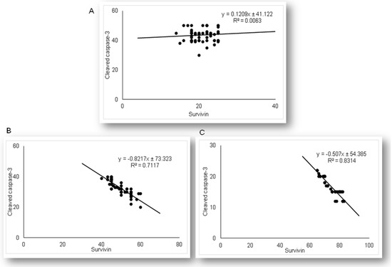 The correlations are shown for survivin and cleaved-caspase-3 in the renal tubular epithelial cells: (A) LPS group only, (B) simvastatin 20 mg/kg group, (C) simvastatin 40 mg/kg group.