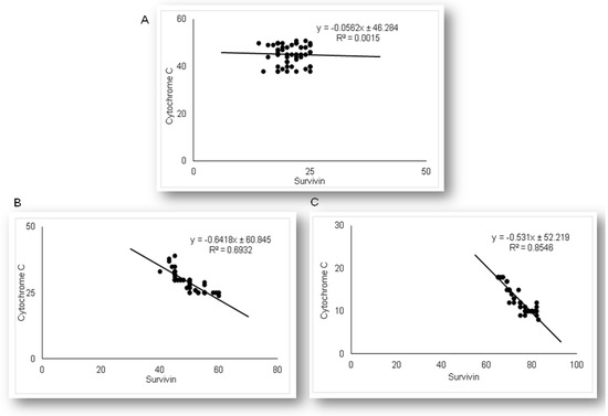 The correlations are shown for survivin and cytochrome C in the renal tubular epithelial cells: (A) LPS, (B) simvastatin 20 mg/kg group, (C) simvastatin 40 mg/kg group.
