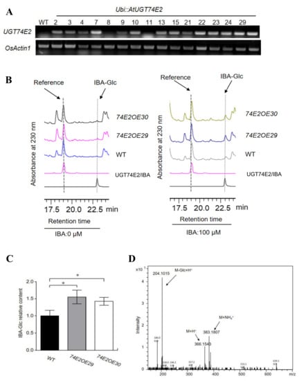 UGT74E2 catalyzes indole-3-butyric acid (IBA) glycosylation in rice. (A) RT-PCR analysis of the mRNA levels of UGT74E2 in transgenic rice plants. (B) HPLC profiling of IBA glucose conjugates (IBA-Glc) extracted from seven-day-old wild type (WT) and UGT74E2-overexpressed lines after 0 μM IBA or 100 μM IBA treatment for 12 h. (C) Relative IBA-Glc contents in UGT74E2 transgenic rice plants (* p < 0.05). (D) LC-MS confirmation of IBA-glucose ester under positive ion mode.