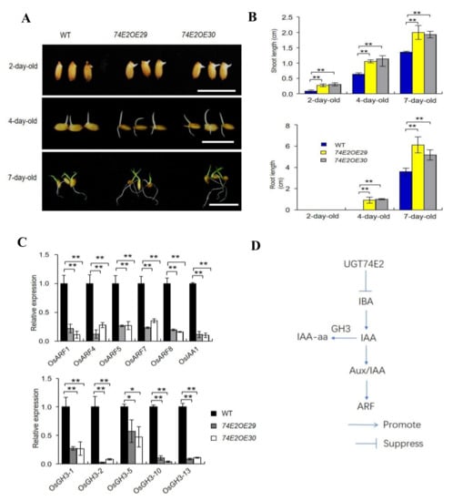 UGT74E2 affected the seed germination and postgermination growth of the transgenic plants. (A) Seed germination and postgermination growth of UGT74E2 transgenic plants. Here, at least 30 seeds were observed for each line (bars = 3 cm). (B) Shoot and root lengths of UGT74E2 overexpression lines for 2, 4, and 7 days. Bars represent standard deviation of at least 10 seedlings. (C) Expression of auxin signaling pathway genes in seven-day-old UGT74E2-overexpressed rice plants compared to WT. Transcript levels were normalized to the mRNA levels of OsActin. Data shown are means ± SD. Student’s t-test was performed (* p < 0.05, ** p < 0.01). Experiments were conducted for three biological replicates. (D) Location of GH3, IAA, and ARF genes in the auxin biosynthesis and signaling pathway.