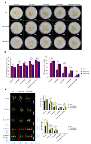 UGT74E2-overexpressed plants are not sensitive to IBA and abscisic acid (ABA) treatment. (A) Seed germination of WT and UGT74E2 transgenic rice under IBA and ABA treatments for eight days. Here, at least 30 seeds were observed for each line (bars = 3 cm). (B) Time to 50% germination and four-day germination rates were calculated in the presence of IBA and ABA. (C) Shoot and root lengths of UGT74E2-overexpressed lines in the presence of IBA and ABA (scale bars = 3 cm). Experiments were conducted for three biological replicates. Bars represent standard deviation of at least 10 seedlings. Student’s t-test was performed (* p < 0.05, ** p < 0.01).
