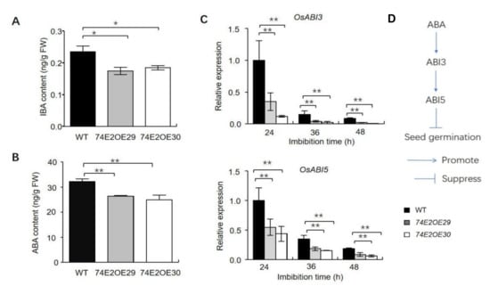 Glycosyltransferases can regulate auxin and ABA homeostasis in plants [24,25]. To further understand UGT74E2 function, the levels of IBA and ABA were assessed after 24 h of seed imbibition. IBA and ABA levels were significantly decreased in germinating seeds in UGT74E2-overexpressed lines compared to in WT plants (Figure 4A,B). Furthermore, ABA signaling pathway gene expression of ABI3 and ABI5 was also detected by qRT-PCR after seed imbibition for 24, 36, and 48 h, respectively (Figure 4C,D). Consistently, the relative mRNA levels of ABI3 and ABI5 were found to be dramatically downregulated in the UGT74E2-overexpressed lines compared to wild type, largely contributing to break seed dormancy and promote seed germination in UGT4E2-overexpressed lines. Since GA is also a key regulator in seed germination and plays antagonistic roles with ABA [26], we also evaluated the expression of several genes involved in GA biosynthesis in imbibed seeds, including GA3ox2, OsGA20ox1, OsGA20ox2, and OsKO2. The results showed that all four genes were upregulated in UGT74E2-overexpressed lines (Figure S1), thereby enhancing GA biosynthesis. This finding, in another aspect, supported our above observation that ABA levels and signaling declined upon UGT74E2 overexpression.