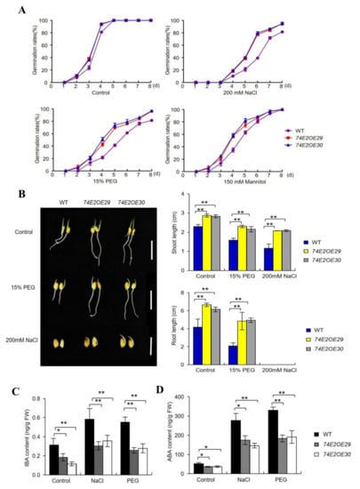 Thirty seeds per replicate of wild type (WT) and UGT74E2-overexpressed lines were imbibed in 9-cm diameter Petri dishes with 10 mL distilled water at 28 °C for 8 days. Seed germination of wild type and UGT74E2-overexpressed lines was also conducted under various concentrations of IBA, ABA, salt, and PEG treatments. The germination rates of the seeds were tested. Three replications were performed.