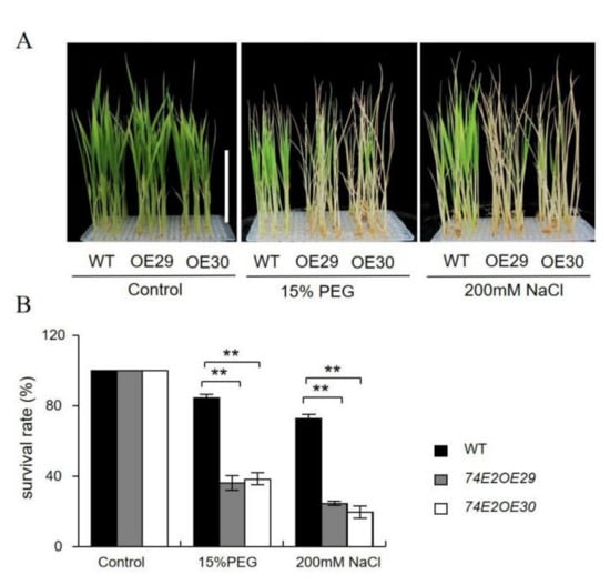 UGT74E2-overexpressed lines are less tolerant to polyethylene glycol (PEG) and NaCl during the seedling stage. The growth (A) and survival rates (B) of UGT74E2 transgenic rice plants upon exposure to 200 mM NaCl and 15% PEG for seven days (scale bars = 10 cm). For each experiment, three biological replicates were performed. Student’s t-test was performed (** p < 0.01).