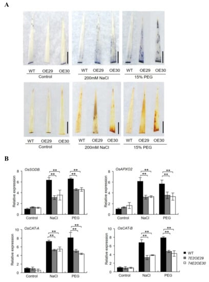 Abiotic stress tends to result in overproduction of ROS and causes oxidative damage to the plants. IBA levels could also affect ROS accumulation in plants [12]. Thus, we performed nitroblue tetrazoliun (NBT) and diaminobenzidine (DAB) staining on the three-week-old, healthy WT and UGT74E2OE plants after they were exposed to NaCl and PEG treatments. Under nontreatment conditions, no staining was observed for the three lines. When treated with NaCl and PEG, all rice leaves were stained, and the color in OE29 and OE30 was much stronger than that in WT plants (Figure 7A), indicating that ROS accumulates more in UGT74E2-overexpressed plants. To explain the process at the molecular level, we also investigated the expression of antioxidant enzyme encoding genes, including OsSODB, OsAPXO2, OsCAT-A, and OsCAT-B. Consistently, upon exposure to NaCl and PEG conditions, the expression levels of these genes were more upregulated in WT than in the UGT74E2-overexpressed plants (Figure 7B), indicating that UGT74E2 overexpression in rice repressed antioxidant gene expression, thereby reducing ROS scavenging capacity.
