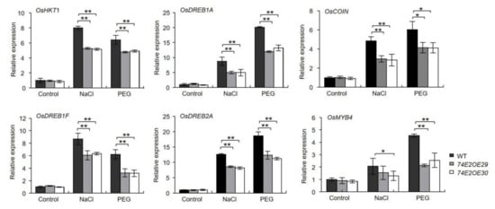 To explore the possible molecular pathways of UGT74E2 involved in regulating stress responses in rice, we evaluated the mRNA levels of four stress-responsive genes with real-time PCR, such as OsHKT1, OsDREB1A, OsDREB1F, OsCOIN, OsMYB4, and OsDREB2A. As shown in Figure 8, under normal conditions, no significant differences were observed. After treatment with NaCl and PEG, the expression of these stress-related genes was greatly elevated, while the upregulation of these genes in wild type was more prominent than in UGT74E2OE lines, implying that overexpression of UGT74E2 could decrease the expression of stress-responsive genes when facing stress conditions, which may contribute to the reduced stress tolerance of the plant.