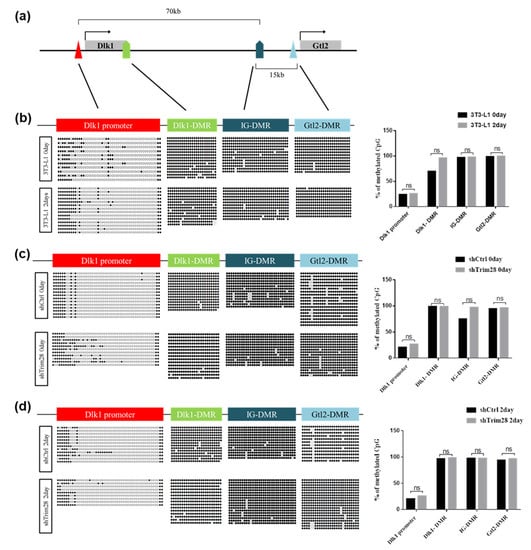 Supplementary materials can be found at https://www.mdpi.com/1422-0067/21/19/7245/s1, Table S1.1 Pathway analysis with Trim28 KD vs. control 3T3-L1 at day 0 by using KEGG pathway database, Table S1.2 Pathway analysis with Trim28 KD vs. control 3T3-L1 at day 2 by using KEGG pathway database, Table S1.3 Bioinformatics analysis with Trim28 KD vs. control 3T3-L1 at day 0 by using GO database, Table S1.4 Bioinformatics analysis with Trim28 KD vs. control 3T3-L1 at day 2 by using GO database, Table S2. Sequences of CpG dyads at Dlk1-Gtl2 locus, Table S3. Primers for real-time PCR, Table S4. The differentially expressed genes of shTrim28 vs. shCtrl on day 0, Table S5. The differentially expressed genes of shTrim28 vs. shCtrl on day 2.