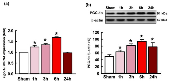 (a) Changes of the pgc-1α mRNA expression and (b) the protein levels of PGC-1α after kainic acid (KA; 0.5 nmol) was microinjected into the hippocampal CA3 subfield. Tissues were harvested from the right subfield CA3 of the hippocampus at 1, 3, 6, or 24 h after administration of KA or phosphate buffered saline (PBS) into the left hippocampal CA3. Values are presented as mean ± SEM of four animals per experimental group. * p < 0.05 versus the control group in the Scheffé multiple-range test.