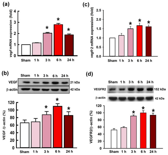Upregulated changes of the expression of vascular endothelial growth factor (vegf) (a) and VEGF receptor 2 (vegfr2) (c) mRNA levels, and VEGF (b) and VEGF receptor 2 (VEGFR2) protein levels (d) after the administration of KA (0.5 nmol) into the hippocampal CA3 region. Samples were collected from the right hippocampal CA3 subfield at 1, 3, 6, or 24 h after the administration of KA or PBS into the left hippocampal CA3 subfield. Values are presented as mean ± SEM of quadruplicate analyses from four animals per experimental group. * p < 0.05 versus the control group in the Scheffé multiple-range test.