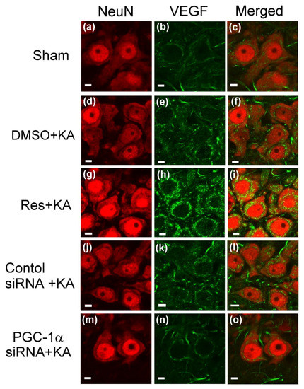 Confocal microscopic images of the right CA3b subregion of the hippocampus showing cells that were immunoreactive to neuron-specific nuclear protein (NeuN) (red fluorescence) or additionally stained for VEGF (green fluorescence) in control rats (Figure 4a–c), or 6 h after administration of kainic acid (KA; 0.5 nmol) (Figure 4d–f) or pre-treatment with resveratrol (Res; 100 μmol) 30 min before KA-induced status epilepticus (Figure 4g–i). Induction of status epilepticus by KA in animals that received pre-treatment with application into the bilateral CA3 subfield 24 h after animals received control siRNA (Figure 4j,i) or siRNA against pgc-1α (2 μg) (Figure 4m–o). Scale bar, 10 μm.
