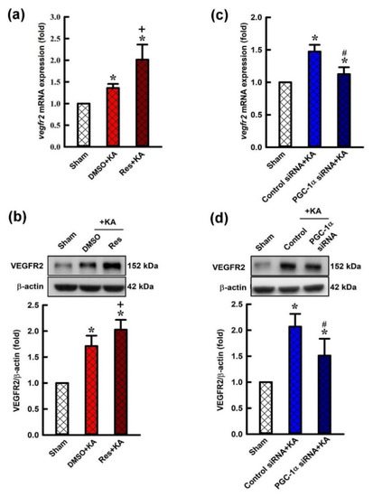 (a) Changes of vegfr2 mRNA expression and (b) changes of VEGFR2 protein in the hippocampal CA3 tissues 6 h after administration with kainic acid (KA; 0.5 nmol) with pre-treatment with resveratrol (Res; 100 μmol), or 3% DMSO into bilateral CA3 subfield. (c) The vegfr2 mRNA expression in the hippocampus 6 h after the administration of KA into the left CA3 area 24 h after pre-treatment of control siRNA or pgc-1α siRNA (2 μg) into the bilateral CA3 subfield. (d) Changes in VEGFR2 protein expression in the CA3 tissue 6 h after the same treatments. Values are presented as mean ± SEM from four animals per experimental group. * p < 0.05 versus control groups, + p < 0.05 versus DMSO+KA group, and # p < 0.05 versus control siRNA+KA group in the Scheffé multiple-range test.