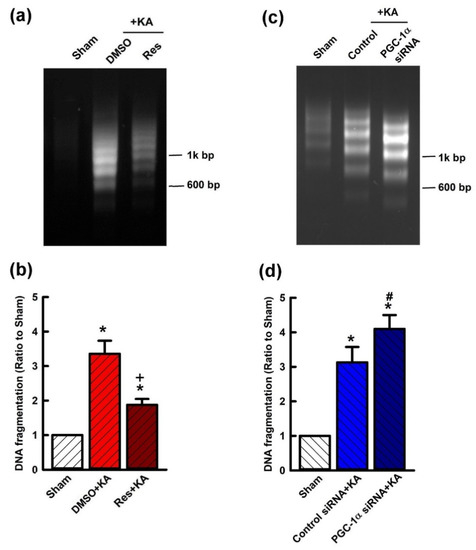 To further confirm the role of PGC-1α/VEGF/VEGFR2 signaling in neuroprotection from hippocampal damage due to prolonged seizure, we investigated the regulatory role of resveratrol on KA-induced hippocampal neuronal cell death. Significantly, pretreatment with resveratrol (100 μmol) attenuated the extent of cleaved caspases-3 expression in the hippocampal CA3 subfield 7 days after KA-induced status epilepticus (Figure 8a). Otherwise, the level of cleaved caspases-3 was significantly increased in the hippocampal CA3 area 24 h before pre-treated microinjection of siRNA against pgc-1α (2 μg) followed by KA microinjection into the hippocampus (Figure 8b). Mitigation of neuronal damage by resveratrol (100 μmol) treatment was demonstrated in the hippocampus in both DNA fragmentation qualitative (Figure 9a) and quantitative (Figure 9b) analyses, indexes for cell death, after inducing status epilepticus for 7 days. On the other hand, the level of qualitative (Figure 9c) and quantitative (Figure 9d) analysis of DNA fragmentation were aggravated in the hippocampal CA3 area 24 h before pre-treated microinjection of siRNA against pgc-1α (2 μg), followed by KA microinjection into the hippocampus.