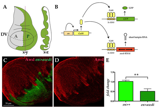 Transgenic RNA interference (RNAi) approach downregulates Awd. (A) The wing disc, like the other imaginal discs, is a sac-like structure (x-z cross section along the vertical plane indicated by red dots) composed of a single layered epithelium whose morphology matures during larval development (x-y frontal section). The dashed lines mark the boundary between anterior (A, grey) and posterior (P, green) compartments as well as the dorso-ventral (DV) boundary. (B) Illustration of the UAS/Gal4 expression system applied to drive targeted coexpression of the UAS-awdi and UAS-GFP transgenes. (C,D) Confocal microscopy image of wing disc dissected from en>awdi larvae and immunostained for Awd (red in C,D). (E) qRT-PCR analysis of awd transcript level in cephalic complexes and wing discs dissected from larvae of the reported genotypes. Graphs represent mean ± SD; n = 3; ** = p < 0.01.