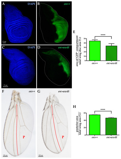 We have previously reported that awd silencing in the posterior domain induces CIN without hyperproliferative effect [15]. In the present study, we quantified the ratio between the posterior domain area and the total area of both en>awdi wing discs (n = 10) and control en>+ wing discs (n = 10), marked by GFP expression. The results showed a statistically significant reduction (Figure 2E) of the posterior domain of en>awdi wing disc (Figure 2C,D) in comparison with the same domain of control wing disc (Figure 2A,B). We extended our analysis to the wing of en>awdi adults which shows defects in the posterior region [15]. The quantification of the ratio between the posterior domain area and total wing area showed a statistically significant reduction of the posterior domain (Figure 2F–H).