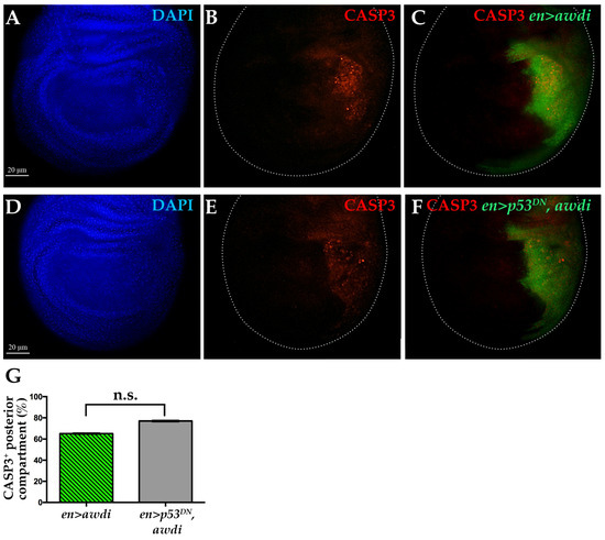 Caspase 3 activation following awdi is unaffected by coexpression of p53DN. Fluorescence microscopy image of wing disc dissected from en>awdi (A–C) and en>p53DN, awdi (D–F) larvae. Wing discs are labelled by DAPI (A,D), anti-activated Casp3 (B,C,E,F) and GFP (C–F). White dots outline wing discs. Quantification of the CASP3-positive wing discs (G). The graphs represent the mean ± SD; n.s.: not statistically significant.