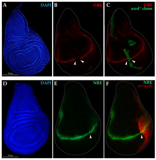 Overexpression of the Wg mitogen in aneuploid CIN cells induces over proliferation of surrounding cells in the wing disc [17]. The absence of hyperproliferative effect in tissue depleted of Awd function is consistent with our previous findings obtained using the null awdJ2A4 allele, in which the Notch signaling is impaired and blocks Wg expression at the wing disc DV boundary [10]. To monitor Notch signaling we used reporter constructs carrying either the lacZ or GFP reporter genes under control of regulatory elements from Notch-responsive genes (see Section 4.1). The expression of the GBE-lacZ (GBE) reporter for Notch activity [26] is absent in clones of cells homozygous for the awdJ2A4 allele (Figure 4A–C) [10]. Since RNAi often leads to incomplete loss of gene function [27], it seemed interesting to analyze the Notch and Wg signaling pathways in en>awdi discs. The expression of the NRE-eGFP transcriptional reporter for Notch activity [28] is unaltered at the dorso-ventral boundary of the wing disc showing that the Notch signaling is active in the posterior compartment of all the en>awdi wing discs (n = 24). (Figure 4D–F).