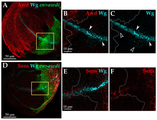 awdi impairs Wg signaling. Confocal microscopy images of wing discs dissected from en>awdi larvae. Wing discs are labelled by anti-Awd (A,B), anti-Wg (A–E), anti-Sens (D,F). Yellow boxes in (A,D) outline the enlarged area showed in (B,C,E,F) respectively. White dots outline the boundary between anterior and posterior compartments (B,C,E,F). White arrowheads mark large aggregates of Wg protein, empty arrowheads mark Wg spots (B,C).