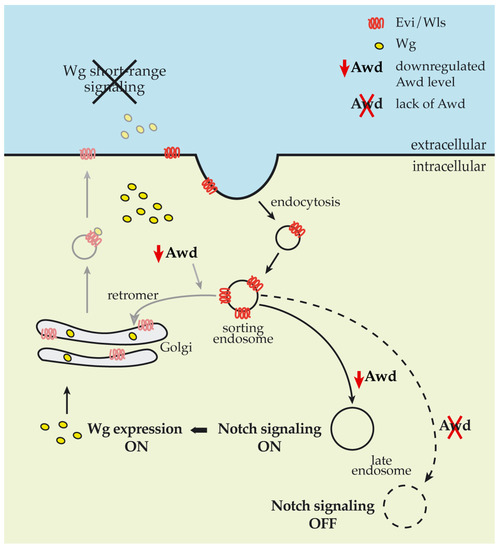 Short-range signaling mainly occurs via apical secretion of Wg from the Wg-producing cell [32]. Evenness interrupted/Wintless (Evi/Wls) and p24/Opium chaperonins are involved in the ER to PM transport of Wg [33,34]. After releasing Wg in the extracellular space, Evi/Wls is endocytosed by the Wg-producing cell and undergoes a retromer-dependent retrograde transport to the trans Golgi network (TGN) [34,35]. Loss of function of the retromer component Vps35 in the wing disc results in reduced Wg secretion and in loss of expression of the short-range target sens while it leaves unaltered the expression of the long-range target distalless [36]. In summary, endocytosis of Evi/Wls chaperonin, and subsequent retrograde transport to TGN, is a key step in short-range Wg signaling. Therefore, we suggest that the Awd endocytic function could be involved in recycling back the Evi chaperonin to the Wg-producing cell (Figure 6).