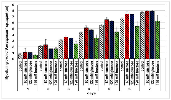 Effects of sucrose, glucose, and fructose on the mycelium growth of Fusarium oxysporum f. sp. lupini. A summary of the statistical significance of differences between the average values of each pair at p < 0.05 can be found in the Supplementary Files (Table S1).