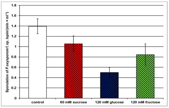 In addition, both 60 mM sucrose, 120 mM glucose, and 120 mM fructose were found to inhibit F. oxysporum sporulation (formation of both macroconidia and microconidia) (Figure 2). It should be emphasized that among tested soluble carbohydrates, glucose inhibited the fungus sporulation most strongly. The sporulation of F. oxysporum on the glucose medium was about 3% less effective than the sporulation of the pathogen on the medium without sugar (control). In turn, sucrose inhibited sporulation by 27% relative to control, while fructose by 42% (Figure 2).