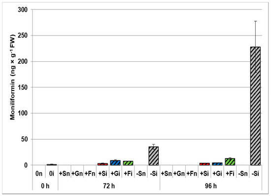 Experiments showed a significant accumulation of moniliformin in infected embryo axes of yellow lupine grown on sugar-free medium (Figure 3). Very high production of this mycotoxin was recorded at 72 and 96 h after infection in the embryo axes of lupine grown without sugars, the level of this mycotoxin being 35 ng × g−1 fresh weight (FW) and 228 ng × g−1 FW, respectively. Additionally, at all time points after infection, a significantly lower moniliformin production was found in embryo axes cultured on sucrose, glucose, or fructose medium than on embryo axes cultured without sugars. For 72 h embryo axes cultured on a medium with 60 mM sucrose (+Si), 120 mM glucose (+Gi), and 120 mM fructose (+Fi), the levels of this mycotoxin were 3.12, 9.24, and 7.75 ng × g−1 FW, respectively. In turn, in 96 h axes grown on a medium with sucrose (+Si), glucose (+Gi), or fructose (+Fi), the moniliformin contents were 3.72, 4.29, and 12.57 ng × g−1 FW, respectively, while they were many times higher in −Si axes compared to all other experimental variants.