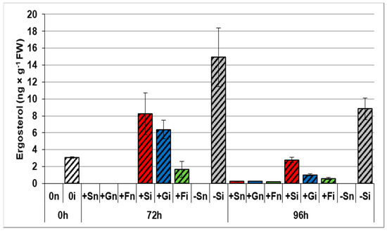 Effects of sucrose, glucose, and fructose on the accumulation of ergosterol in in vitro cultured embryo axes of Lupinus luteus infected with Fusarium oxysporum f. sp. lupini. (+Sn, non-inoculated embryo axes and cultured in vitro on Heller’s medium with 60 mM sucrose; +Gn, non-inoculated embryo axes and cultured in vitro on Heller’s medium with 120 mM glucose; +Fn, non-inoculated embryo axes and cultured in vitro on Heller’s medium with 120 mM fructose; −Sn, non-inoculated cultured in vitro on medium without sucrose; +Si, inoculated and cultured with 60 mM sucrose; +Gi, inoculated and cultured with 120 mM glucose; +Fi, and with 120 mM fructose; −Si, inoculated and cultured without sucrose). A summary of the statistical significance of differences between the average values of each pair at p < 0.05 can be found in the Supplementary Files (Table S3).