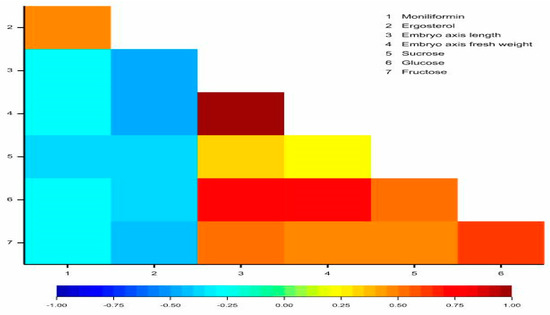 Heatmap matrix for linear Pearson’s correlation coefficients between moniliformin, ergosterol, embryo axis length, embryo axis fresh weight, sucrose, glucose, and fructose (rcr = 0.2686).