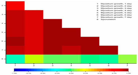 Heatmap matrix for linear Pearson’s correlation coefficients between mycelium growth (observed in 1–7 days) and sporulation (rcr = 0.3125).