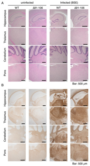 - Hara, H.; Miyata, H.; Das, N.R.; Chida, J.; Yoshimochi, T.; Uchiyama, K.; Watanabe, H.; Kondoh, G.; Yokoyama, T.; Sakaguchi, S. Prion protein devoid of the octapeptide repeat region delays bovine spongiform encephalopathy pathogenesis in mice. J. Virol. 2018, 92, e01368-17. [Google Scholar] [CrossRef]