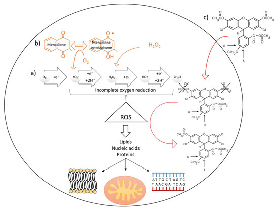 (a) Naturally occurring intracellular reactive oxygen species (ROS) production and consequences on cellular components (cell membranes, mitochondria and DNA); (b) H2O2 and menadione contribution to intracellular ROS accumulation (orange arrows indicate how these molecules contribute to the incomplete reduction of oxygen) and (c) CM-H2DCFDA ROS-sensitive probe mechanism of action. Red arrows indicate movement of the probe from the extracellular to the intracellular space (up) and contribution of ROS to the oxidation of the probe (down).
