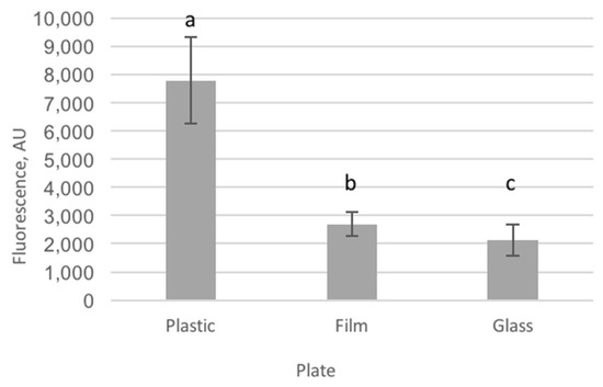 Background fluorescence was measured in plastic, film and glass plates to select the plate showing the lowest autofluorescence. Plastic plates showed the highest autofluorescence and glass plates the lowest (p < 0.001, Figure 2). Film plates showed lower (3-fold) autofluorescence than plastic but slightly higher (1.3-fold) autofluorescence than glass plates.