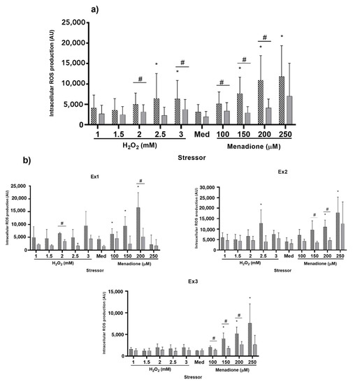 First, the stressor capacity of the different agents was evaluated. When using the whole set of data (n = 9), H2O2 at 2.5 and 3 mM as well as menadione at 150 to 250 μM showed a statistically significant increase in ROS production when compared to non-stressed cells (p < 0.0001 for the stressor effect; Figure 4a). The stressor effect was observed in all three experiments (p = 0.0322 in Ex1, p = 0.0026 in Ex2 and p < 0.0001 in Ex3). Only 200 μM menadione was identified to increase intracellular ROS accumulation in all three independent replicates. Moreover, menadione at a concentration of 150 and 250 μM significantly increased intracellular ROS in two out of three experiments (Figure 4b).