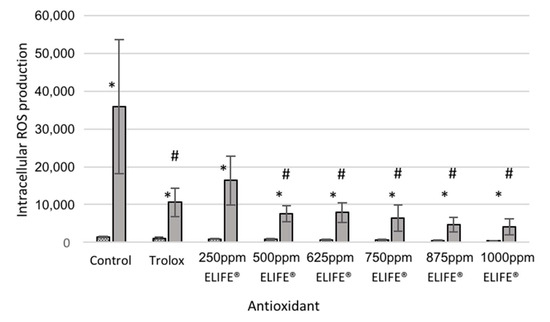 ROS production after an 18-h pre-incubation with: control (colorless growth medium containing no antioxidant), trolox (colorless growth medium containing 2 mM trolox) and different concentrations of ELIFE®, followed by a one-hour incubation with medium (colorless growth medium containing no stressors, dotted bars) or 200 μM menadione (in colorless growth medium, solid grey bars). ROS production in different conditions was determined by fluorescence measurement (measured in arbitrary units, AU). Different asterisks (*) indicate statistically significant differences in ROS production in non-stressed and menadione-treated cells (i.e., stressor effect). Hashtags (#) represent a statistically significant decrease in ROS production after incubation with ELIFE®/trolox when compared to control cells (antioxidant effect). Data represent means ± SD (n = 3). p < 0.05.
