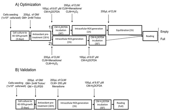 Graphical overview of the different steps included in (A) the optimization and (B) validation of the in vitro oxidative stress measurement. (1) and (2) are different protocols tested during the optimization process in order to obtain the best signal-to-noise ratio. GM refers to growth medium, CLM refers to colorless growth medium and ROS to reactive oxygen species. Fluorescence (Ex/Em: 495/520 nm) was detected under two different conditions: before (full) and after (empty) discarding the buffer containing the CM-H2DCFDA probe and washing the wells twice with PBS.