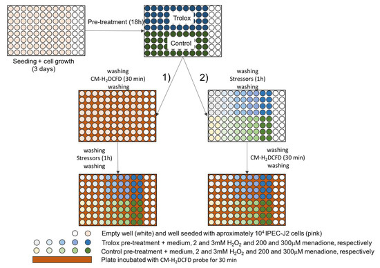 First, the protocol described by Vergauwen and co-workers [17,18] was followed (protocol 1 in Figure 6A). Briefly, the IPEC-J2 monolayer was pre-incubated overnight with or without trolox. The next day, the cells were washed twice, followed by incubation for 30 min with 100 μL of 8.67 μM CM-H2DCFDA (diluted in washing buffer) after which the cells were washed twice. Subsequently, the cells were incubated for 1 h with colorless medium containing no stressor (medium), H2O2 (H2O2) (2 or 3 mM, Sigma-Aldrich, Overijse, Belgium) or menadione sodium bisulfite (menadione) (200 or 300 μM, Sigma-Aldrich, Overijse, Belgium) followed by washing twice. Finally, the colorless culture medium was refreshed and equilibrated for 1 h before analyzing the fluorescence.