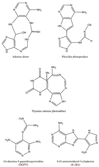 Purine photoproducts: adenine dimer, Pörschke photoproduct, thymine-adenine photoadduct, 4,6-diamino-5-guanidinopyrimidine (DGPY), and 8-(5-aminoimidazol-4-yl)adenine (8-AIA).