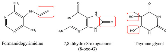 Oxidized DNA bases: formamidopyrimidine derivative of adenine (Fapy-A), 7,8 dihydro-8-oxoguanine (8-oxo-G), and thymine glycol. Modifications of the proper base structures by ROS were highlighted with the red boxes.