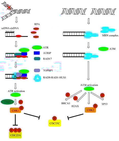 Ataxia telangiectasia and Rad3-related protein (ATR) and ataxia telangiectasia mutated (ATM)-mediated DNA damage response (DDR) pathways activated upon DNA damage. The details are discussed in text.