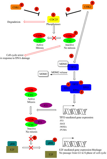 CHK1 kinase is activated mainly by ATR, and this is mediated by Claspin protein. CHK1 regulates activity of two M-phase inducer phosphatases CDC25C and CDC25A. Under normal conditions, CDC25 phosphatases activate CDK1-cyklin B complexes, leading to cell cycle progression. Activation of CHK1 in response to DNA damage leads to phosphorylation and subsequent degradation of CDC25. This event leads to cell cycle arrest. On the other hand, CHK2 activation is mainly achieved via ATM-mediated phosphorylation and leads to TP53 activation. Additionally, ATM and ATR may also directly phosphorylate TP53 [60]. This is accompanied with the release of TP53 inhibitor—E3 ubiquitin-protein ligase (MDM2) [61]. TP53 is one of the best known suppressor proteins. It is estimated that half of all human tumors carry a mutation in the TP53 gene [62]. Phosphorylated in response to UV damage, TP53 forms tetrameric transcription factor that regulate expression of various genes including cyclin-dependent kinase inhibitor 1A (P21) and the pro-apoptotic (BAX) and Bcl-2-binding component 3 (PUMA) proteins. P21 (up-regulated in a TP53-mediated gene expression) form complexes with cyclin-CDK leading to cell cycle arrest. Furthermore, P21 inhibits CDKs preventing the phosphorylation of the retinoblastoma-associated protein (pRB), thereby disabling the G1 to the S transition of the cell cycle (Figure 6) [61,63,64].