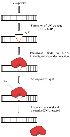 The simplest example of DNA repair mechanisms is certainly direct reversal of damage. The main features of this damage control are (I) extreme simplicity manifested by participation of only one enzyme for each repair mechanism, (II) narrow substrate specificity and high accuracy, (III) and relation to previous points relatively high speed of action compared to multistep processes. There are three major types of direct DNA repair: (a) reversal of UV-induced photolesions carried by photolyases, (b) repair of O-alkylated DNA by O6-alkylguanine-DNA alkyltransferases, and (c) repair of N-alkylated bases by AlkB family dioxygenase enzymes [77]. Here, we focus on photolyases as the main enzymes responsible for UV-damage removal.