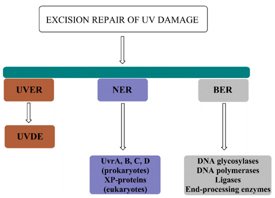 Excision repair pathways for the repair of UV damage include UV-damage endonuclease (UVDE)–mediated repair (UVER), nucleotide excision repair (NER) composed of Uvr proteins in prokaryotes and XP proteins in eukaryotes, and base excision repair (BER) for the repair of UV-induced oxidative damage.