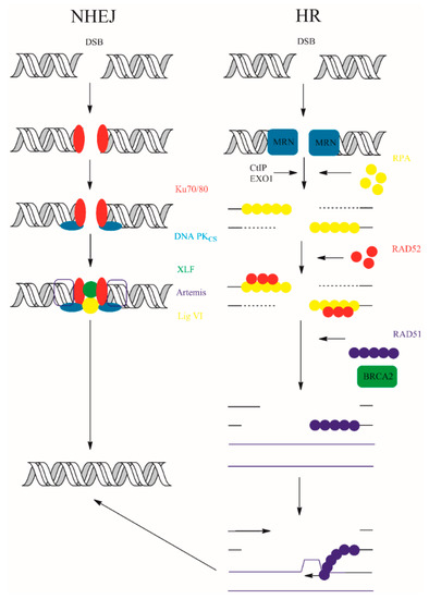 In contrast, NHEJ is active throughout the cell cycle. The sensory X-ray repair cross-complementing protein 5/6 (Ku70/80) and DNA-PKcs form synapses, a DNA-protein complexes with broken DNA ends [121]. Many other components: X-ray repair cross-complementing protein 4 (XRCC4), XLF (Cernunnos), or DNA ligase IV participate together with synapse components for efficient repair. Non-ligatable ends can be connected following processing with accessory enzymes ARTEMIS, aprataxin (APTX), and PNK-like factor (APLF). Two variants of canonical NHEJ pathway exist—Ku-independent NHEJ pathway microhomology-mediated end-joining (MMEJ) and alternative end-joining (AEJ)—but their activity is connected with sequence deletions [4]. The participation of DNA polymerase in the NHEJ pathways is still questionable. However, some studies suggest participation of DNA polymerase λ (Pol. λ) and/or polymerase μ (Pol. μ) in repair process [122,123,124]. The schematic representation of eukaryotic NHEJ and HR is shown in Figure 9.