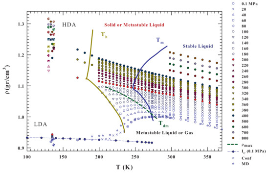 Bulk water density isobars, from to 800 MPa and the temperature range K (i.e., from the regions of the two amorphous LDA and HDA phases and supercooled liquid state to the region of the boiling temperature), are illustrated in Figure 2. These literature data also refer to bulk liquid water inside the metastable supercooled region [3,19,56,57,58,59,60,61] and to LDA and HDA [6,30,31,32]. The dashed green line represents the locus of the density maxima . For comparison purposes, Figure 2 also reports, data of bulk water density at ambient pressure in other conditions: (i) ice Ic; (ii) under confinement in nanotubes [51,52]; and, (iii) the results of a MD simulation of the state equation by using the TIP4P/2005 model [37].