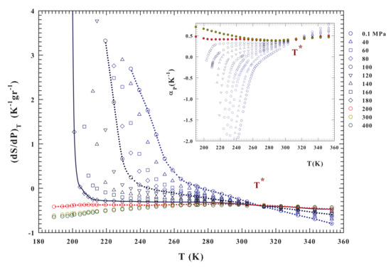 The liquid water isothermal pressure derivative of the entropy and thet thermal expansion coefficient isobars (inset). These functions are calculated from the density data (Figure 2) in the range K for the pressures and 400 MPa. For both the corresponding isobars can be observed that they cross at the same temperature . In both figure and inset it is observed that the data behaviors above and below MPa are completely different in curvature and absolute values. Large entropy variations are observable only below such a pressure; while the most significant is found for MPa.