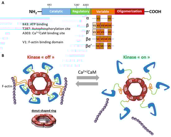 Although the two main brain isoforms show similar domain structure and high sequence homology (89%–93% sequence homology in the catalytic and regulatory domains in rats) [7], they differ within the N-terminal part of the variable region, where CaMKIIβ, but not CaMKIIα, contains a filamentous actin (F-actin) binding domain (FABD) (Figure 1A). CaMKIIβ not only binds to actin [8], but it is also capable of bundling actin thanks to its actin-binding and association domains [9]. This bundling feature is achieved by the CaMKII oligomers binding to multiple actin filaments. It should be mentioned that the variable region, where CaMKIIα and β differ most, is subject to alternative splicing in all CaMKII isoforms. Regarding CaMKIIβ, four splicing variants, β, β’, βe, and β’e, were discovered in the brain, but only β and β’variants contain a FABD and are, therefore, able to bind to F-actin [10,11,12,13] (Figure 1A).