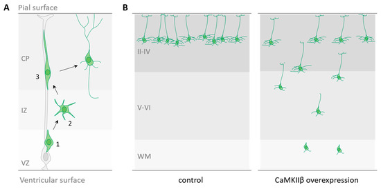 After their birth, neurons migrate to reach defined locations, where they integrate into functional circuits. Recently, we and others have shown that CaMKIIβ has a role during embryonic radial migration of cortical projections neurons [18,38]. Briefly, during the development of the cerebral cortex, projection neurons, born from progenitors in the germinal zone of the dorsal telencephalon, radially migrate following a route that is perpendicular to the ventricular surface before settling in their final laminar position [39]. Radial migration is a multi-step process that starts with the detachment of nascent neurons from the apical surface of the germinal ventricular zone (VZ) (Figure 2A step 1). Newly generated neurons then move to the intermediate zone (IZ), where they acquire a multipolar shape (Figure 2A step 2). Thereafter, neurons become bipolar, extending a leading process towards the pial surface and a trailing process in the opposite direction. Upon multi to bipolar transition, neurons establish dynamic contacts with radial glia fibers and subsequently use them as a scaffold for migrating to the upper part of the cortical plate (CP) using a mode of migration called locomotion (Figure 2A step 3).