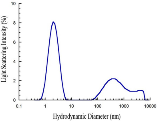 We calculated the theoretical hydrodynamic radius (Rh) for a peptide with the size of PrP107–120 (14 amino acid residues) in an unfolded state, using the equation described in Section 4, and previously published in [51]. According to this equation, the Rh value was found to be 0.99 ± 0.56 nm. Dynamic light scattering (DLS) shows that PrP107–120 dissolved in water has a hydrodynamic diameter (Dh) of 2.11 ± 0.68 nm, corresponding to a Rh of 1.05 ± 0.34 nm (Figure 1), which is in good agreement with that estimated theoretically. The DLS distribution also showed very large PrP107–120 aggregates at 70–7000 nm, but these are quantitatively irrelevant, as light scattering intensity is known to scale with the sixth power of the size. These results reveal that PrP107–120 dissolved in water is unfolded and predominantly non-aggregated.