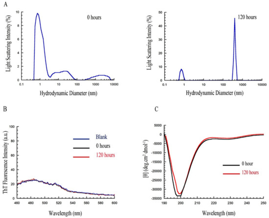 Effect of 20 mM phosphate buffer, 200 mM Na2SO4, pH 7.0, 37 °C on PrP107–120 (1.0 mg/mL) aggregation. (A) Size distributions by light scattering intensity of the peptide sample obtained with DLS at t = 0 h (left) and 120 h (right) under the conditions described above. (B) Thioflavin T (ThT) fluorescence spectra with buffer (blank) and PrP107–120 sample after 0 and 120 h. Peptide sample was incubated as described above. ThT assay was carried out at 22 µM ThT, 0.12 mg/mL PrP107–120 (final concentrations in the cuvette), pH 6.0, 37 °C. (C) Far-UV circular dichroism (CD) spectra of PrP107–120 incubated for 0 and 120 h. Peptide sample was incubated as described above and diluted to 0.2 mg/mL in the same buffer before spectrum acquisition at 25 °C.