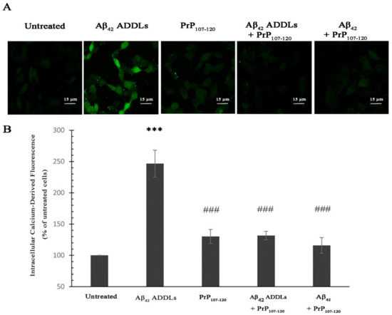 An early cellular insult caused by Aβ42 ADDLs, and Aβ42 oligomers more generally, when added to the cellular medium, is the permeabilization of the plasma membrane with a rapid influx of calcium ions (Ca2+) from the extracellular space to the cytosol [53,58,60]. To investigate whether PrP107–120 can prevent the increase of Ca2+ levels mediated by the Aβ42 ADDL oligomers, we monitored the influx of Ca2+ in SH-SY5Y cells treated with Aβ42 ADDLs in presence and absence of PrP107–120, at the same concentrations used for the MTT assay. The quantification of the intracellular Ca2+-derived fluorescence in confocal microscopy images shows that the treatment of the cells with Aβ42 ADDLs caused a significant increase in intracellular Ca2+ up to 246 ± 21% compared with untreated cells, taken as 100% (Figure 4). By contrast, the cellular exposure to Aβ42 + PrP107–120, Aβ42 ADDLs + PrP107–120 and PrP107–120 alone triggered a minor increase of intracellular Ca2+-derived fluorescence (i.e., to 116 ± 13%, 132 ± 7% and 130 ± 11% respectively) that was significantly lower than that observed in cells treated with Aβ42 ADDLs (Figure 4). This result suggests a protective role of PrP107–120 in the Ca2+ influx mediated by the Aβ42 oligomers in neuronal cells. Since the concentrations of Ca2+ and PrP107–120 in the cell medium were 2 mM and 0.75 µM, respectively, it can be ruled out that the inhibition of ADDL-induced Ca2+ influx mediated by the prion peptide arises from peptide-Ca2+ binding, as the peptide is over three orders of magnitude sub-stoichiometric.