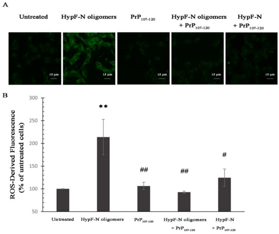 Analysis of intracellular ROS levels of SH-SY5Y cells treated with type A HypF-N oligomers and PrP107–120. (A) Representative scanning confocal microscopy images of intracellular free ROS levels in SH-SY5Y cells loaded with CM-H2DCFDA. The cells were treated for 1 h with HypF-N oligomers, PrP107–120, HypF-N oligomers + PrP107-120 and a sample containing HypF-N and PrP107–120 pre-incubated under conditions promoting HypF-N oligomer formation prior to addition to the cell medium. Final HypF-N and PrP107–120 concentrations were 12 and 3 µM (m.e.), respectively. Scale bar = 15 µm. (B) Semi-quantitative analysis of intracellular ROS-derived fluorescence. Experimental errors are S.E.M. (n = 3). The double (**) asterisks refer to p values < 0.01 relative to the untreated cells. The double (##) and single (#) symbols refer to p values < 0.01 and < 0.05, respectively, relative to HypF-N oligomers.